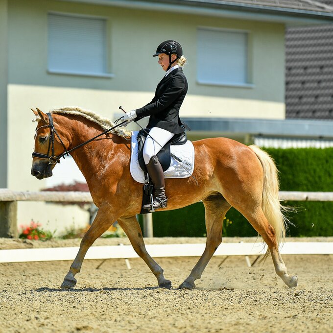 Der Großteil ihrer Pferde sind HAFLINGER. Sie sind robuste und trittsichere ALPEN-ALLROUNDER. „Mit ihnen kannst du auf dem Platz, im Gelände und auf Turnieren reiten oder sie vor eine Kutsche spannen. Warmblüter wie mein CORTADO sind groß und nicht so brav im Gelände. Sie eignen sich besser als Sportpferde", erklärt die Pferdeliebhaberin.