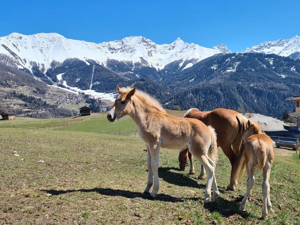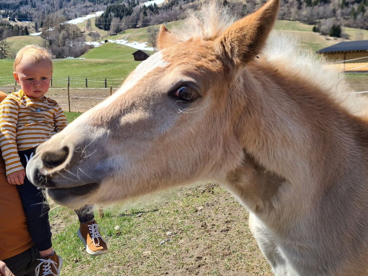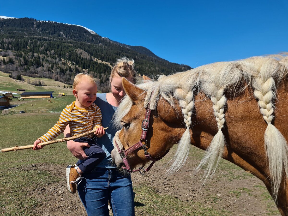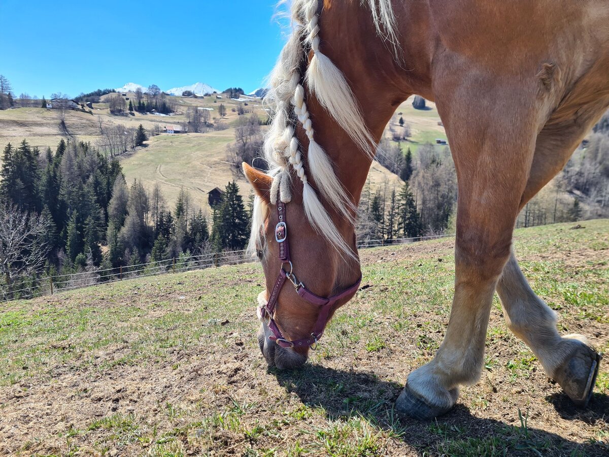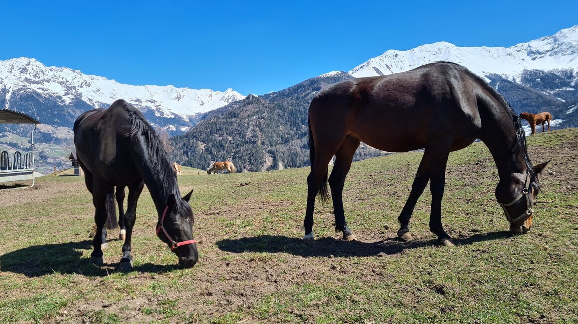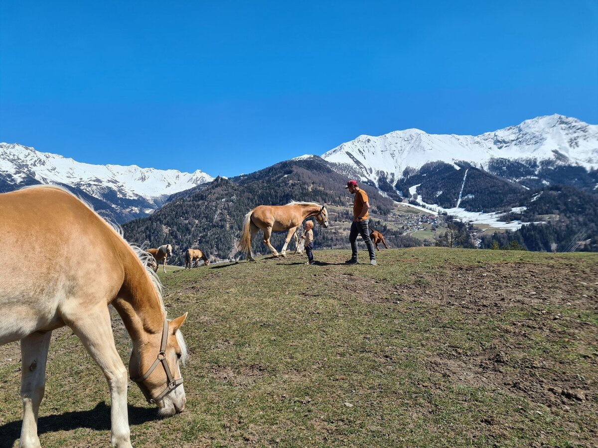 Auf der Weide mit der beeindruckenden Bergkulisse im Hintergrund tummeln sich verschiedenste PFERDERASSEN: Haflinger, Warmblüter und Isländer sowie das Dartmoore-Pony Toni aus England. Die Tiere sind übrigens jeden Tag an der frischen Luft und kaum im Stall. Mehr Freiraum geht kaum. Von Juni bis September geht es für die meisten Pferde hinauf auf die ALM zur Sommerfrische.