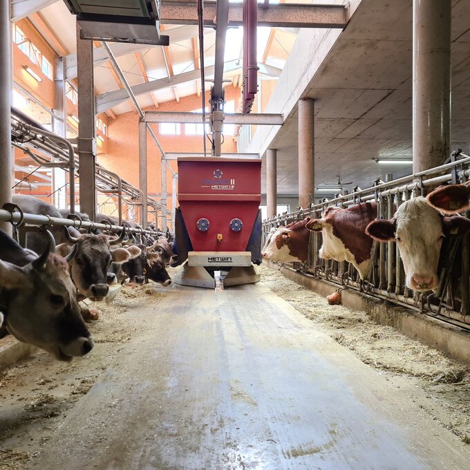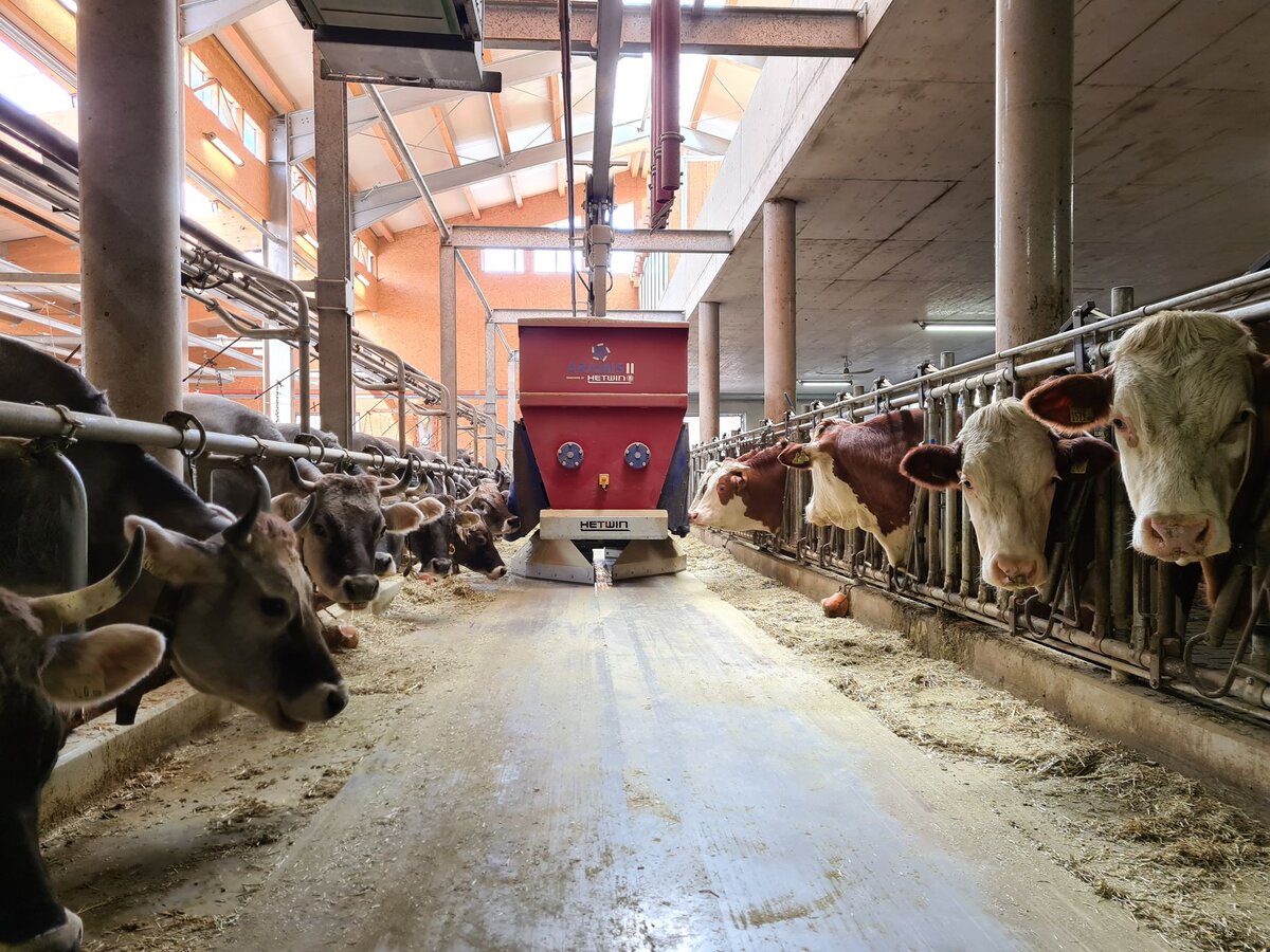 Eine zeitintensive Fütterung per Hand ist durch den FÜTTERUNGSROBOTER nicht mehr notwendig. Die Kühe bekommen vollautomatisch mehrmals täglich frisches Futter: um 5.30, 6.30, 10.30 und 12.00 Uhr sowie zweimal abends. Mit einem Kran wird ein Behälter befüllt, das Futter wird dann automatisch gemischt, abgewogen und verteilt. Mit einer App ausmisten? Klingt erstmal sehr seltsam. Aber bei Familie Netzer geht man mit der Zeit und navigiert bequem mit dem Handy den AUSMISTUNGSROBOTER am Boden. Was mit Bluetooth alles möglich ist. Der Stall spielt wirklich alle Stücke. So modern kann Landwirtschaft also betrieben werden. In ganz Tirol gibt es keinen vergleichbaren Hof.
