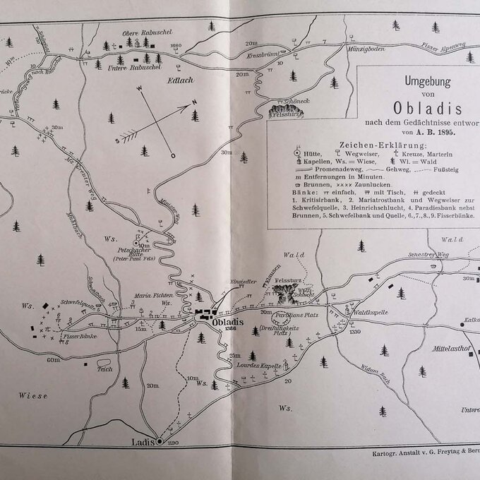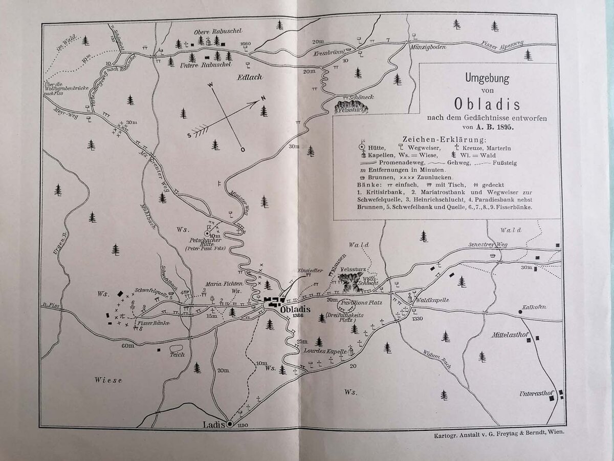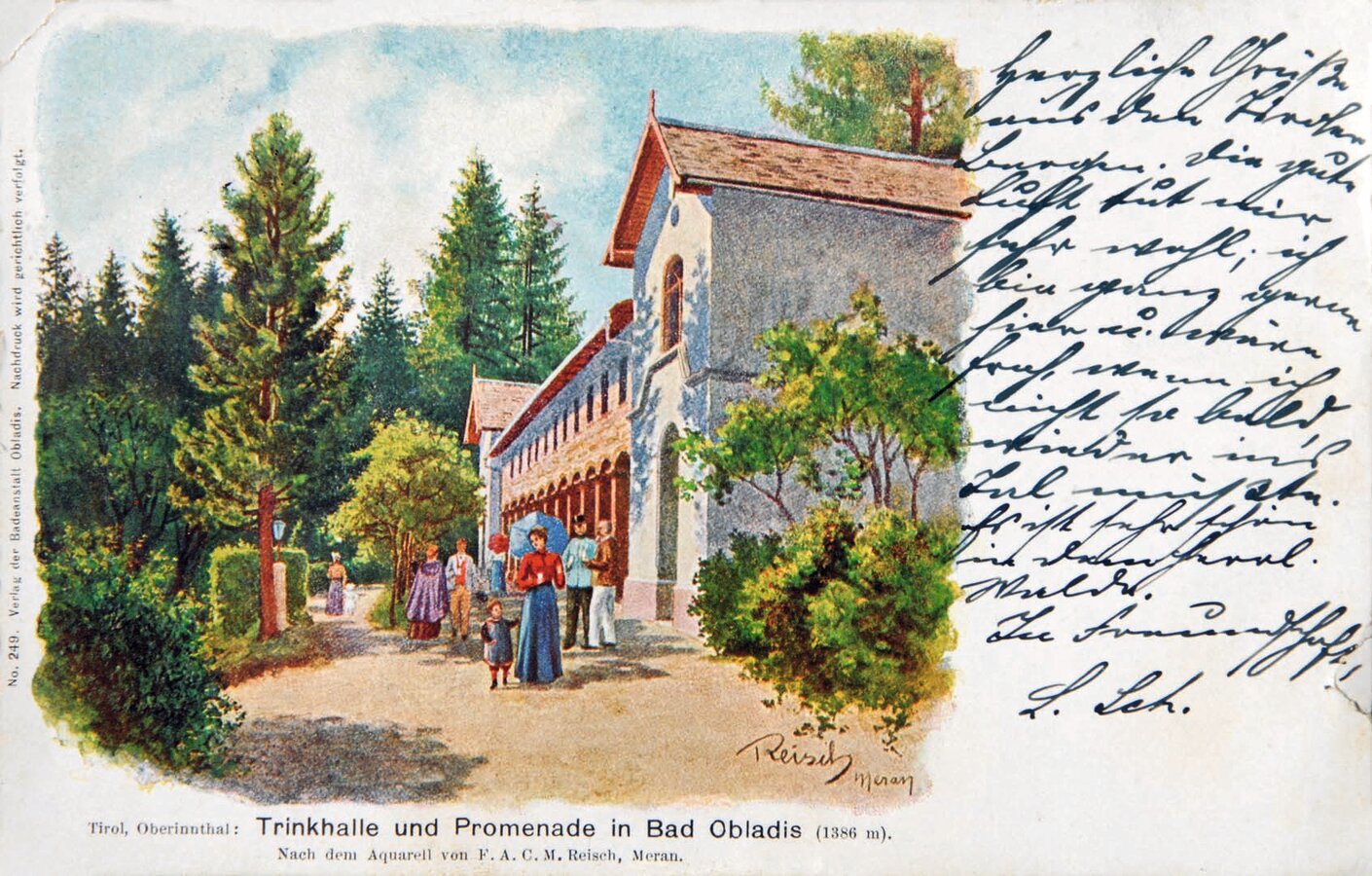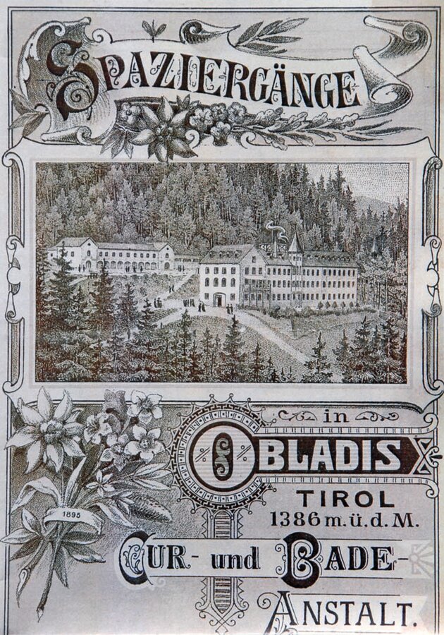 Bad Obladis, Österreichs höchstgelegenstes Kurhotel (1386 Meter), ist durch das Zusammentreffen einer Reihe besonderer Vorzüge bemerkenswert. Eines der ältesten Etablissements dieser Art im Lande Tirol, verdankt der Ort seine Entstehung der dort entspringenden Heilquellen : Kalksäuerling und erdalk. sulf. Schwefelquelle. Obladis hat sehr mildes Klima (das nach den meteorologischen Untersuchungen von Prof. v. Ficker, Berlin, großen Annäherung an den Schweizer Kurorte zeigt), starke Höhensonne und eine gegen Osten und Süden freie Lage inmitten ausgedehnter Fichtenwälder. Ein seltener Rundblick, der gegen den Himmel mit einem Kranz gewaltiger Berge schließt, sowie Ruhe und Abgeschlossenheit vom hastigen Weltgetriebe sind daneben nicht minder stärkend für Leib und Seele.