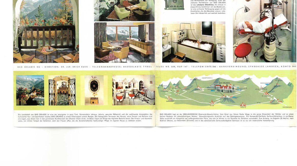 Bei meinem Besuch kramt Burgl auch einige alte Urlaubsprospekte aus. Die Illustrationen könnten in der heutigen Zeit beinahe als hip bezeichnet werden. Auch die Ausstattung des Hotel in den 50er Jahren kann locker mit heutigen Designermöbeln mithalten. Flair hatte das Hotel auf jeden Fall. Die bunten Seiten verführten den Leser, oftmals bereits in mehreren Sprachen, zu einem Erholungsurlaub in Obladis. Vorhang auf für einen Schwenk in alte Zeiten: