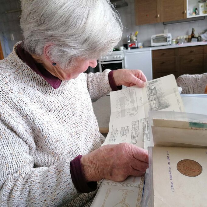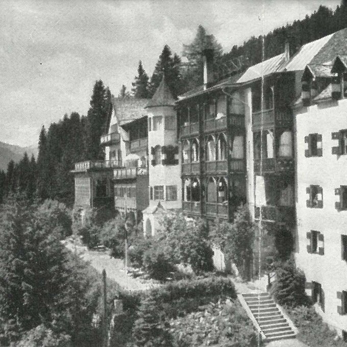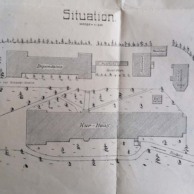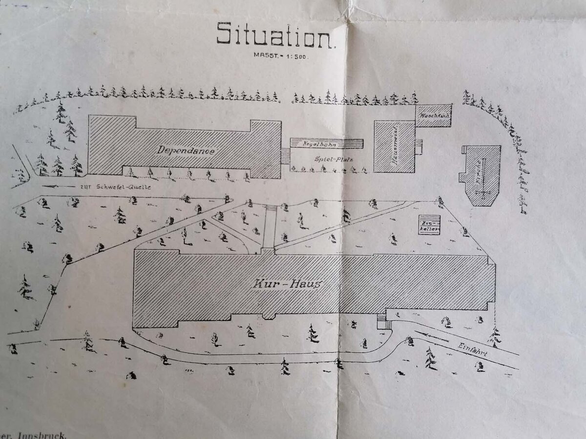 1835 startete man mit einem Nobelhotel in die erste Sommersaison. Früh erkannten die Gäste, dass das burggekrönte Dorf ein magischer Ort ist. Das Hotel wurde ständig erweitert und glänzte mit allerlei Annehmlichkeiten: Zentralheizung, Kalt- und Warmwasserleitungen, elektrisches Licht, tägliche Postzustellung, fernmündliche Dauerverbindung, ärztliche Betreuung, Kurmittel und Bäder, Schwimmbad mit Kinderplanschbecken und vieles mehr. Burgl zeigt mir auf dem Plan, dass wir uns gerade in der Dependance des ehemaligen Hotels befinden, also im Nebengebäude. Das gegenüberliegende "Kur-Haus" brannte aus ungeklärten Gründen in den 70er Jahren ab und wurde nie wieder aufgebaut. Bei meinem Besuch bei Burgl habe ich aber das Gefühl als wäre die Zeit der Kurbäder erst gestern gewesen. Die Geschichten aus den alten Zeiten sprudeln nur so aus ihr heraus. Gespannt lausche ich ihren Worten.
