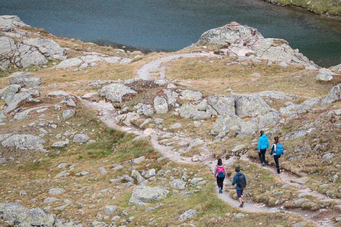 Von der Bergstation der Lazidbahn (S301) geht es zunächst auf dem breiten Fahrweg bis zur Scheid (S217). Vom WW (S218) hinter der Liftstation führt der Weg auf den Murmeltiersteig 25a, über das Kitzköpfl zum Furglersee (S211). Vom Furglersee folgt man dem Weitwanderweg 702 (Steig 21), durchquert die Malfristwiesen bis zum Komperdell (Kölner Haus).