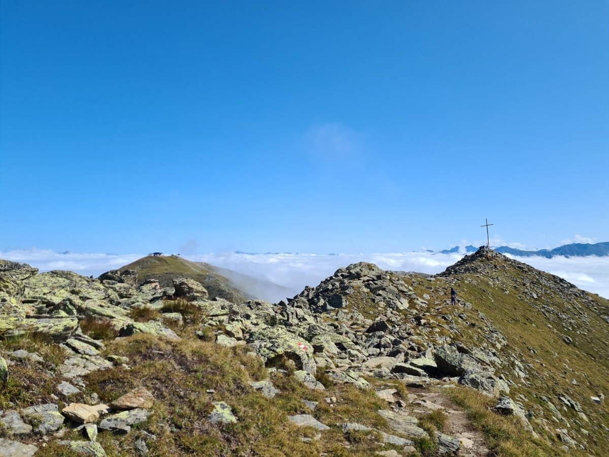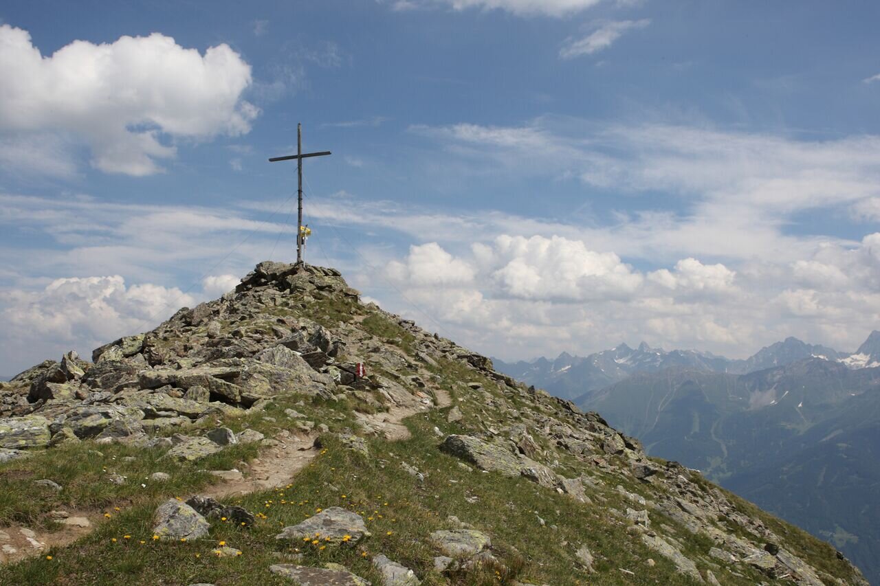 Von der Bergstation Komperdell (S201) in nördlicher Richtung auf dem breiten Weg bis zum WW (S202). Auf dem Quellenweg aufwärts, streckenweise durch mooriges Gelände, über Weiden der Komperdellalpe zum Mittleren Sattelkopf (S250) und weiter auf Steig 11 steil ansteigend zum Gipfelkreuz am Oberen Sattelkopf (F110). Variante: Abstieg über Gratsteig 23 zum Fisser Joch.
