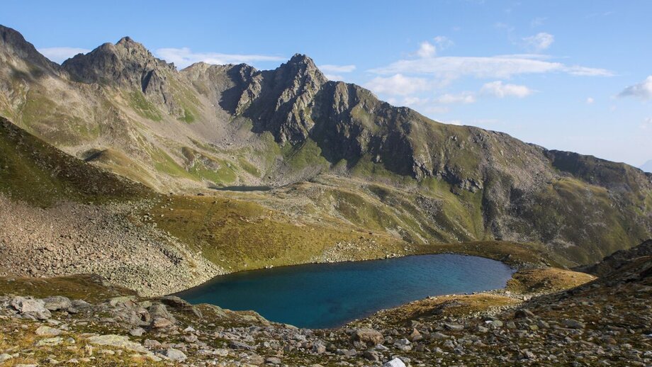Den Oberen Spinnsee erreicht man wie zuvor bei Weg 16 beschrieben. Vom See nun links hoch über Steinkare zur Spinnscharte 2.681 m (F106a) und über einen Blockgrat mit schöner Steiganlage und kurzer Drahtseilversicherung zum Gipfel 2.936 m (S275). Abstieg eventuell über Kübelgrubenscharte (S276) und Urgjoch (S271) zum Komperdell (S103) 3 Stunden, oder über Planskopf (S260) und den Gratweg zurück zum Fisser Joch (F087).