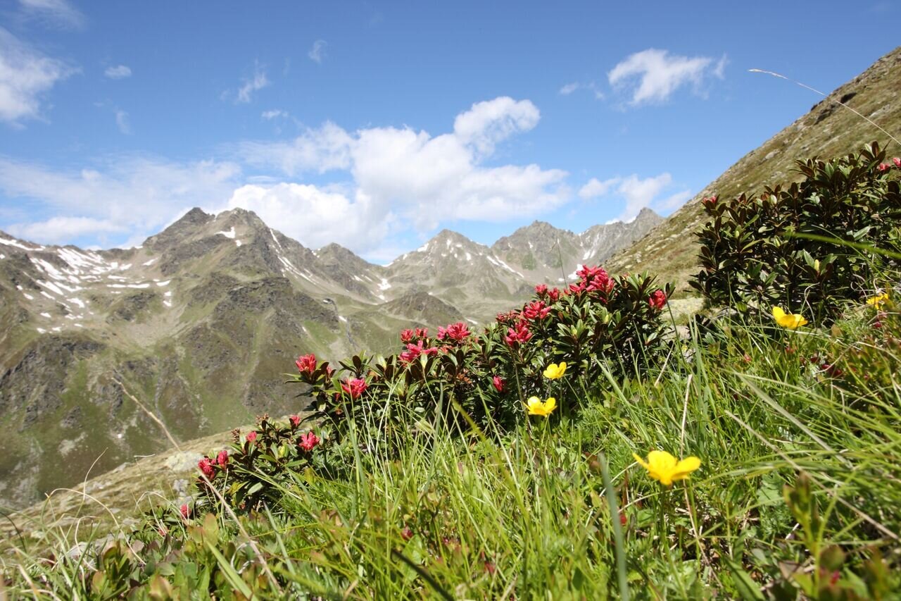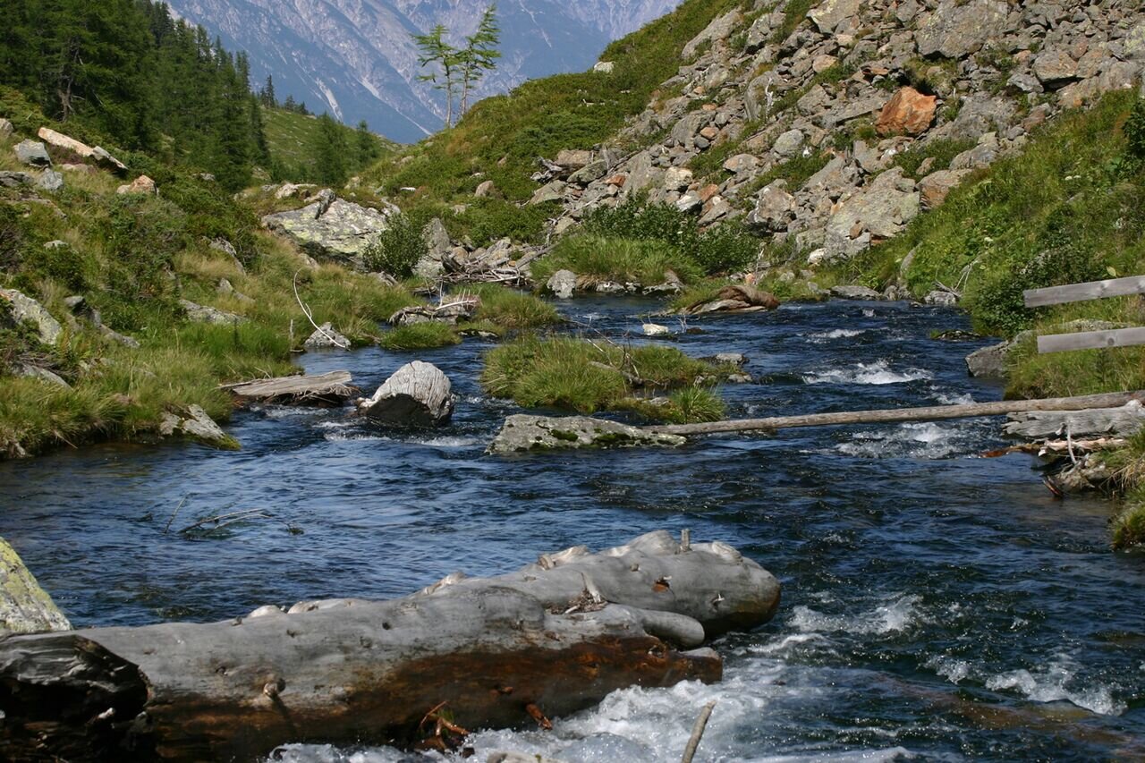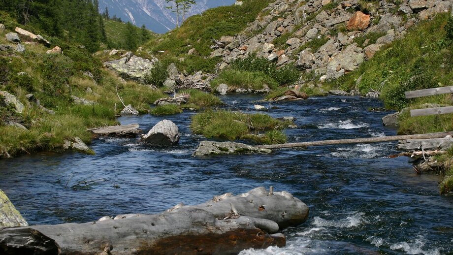 Vom Fisser Joch (F087) über den Spinnseensteig Nr. 16 in den Talgrund des Urgtales, bei der Brücke (F107) rechts auf Weg 17 dem Tal entlang zur Schöngampalm (F039).
