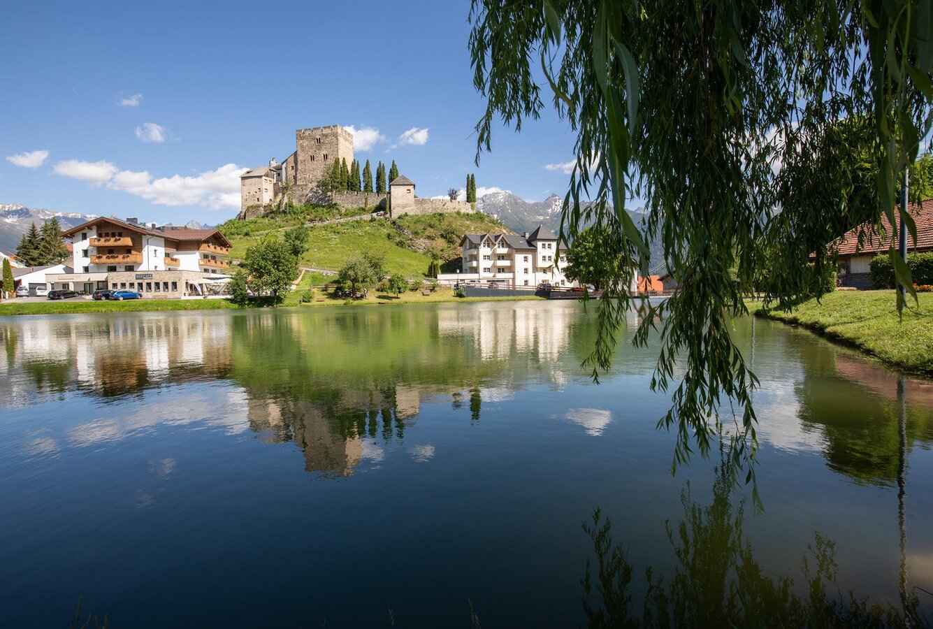 The castle hill on the northern and western side of the mountain descends moderately steeply to the pond (castle pond) and to the village of Ladis.