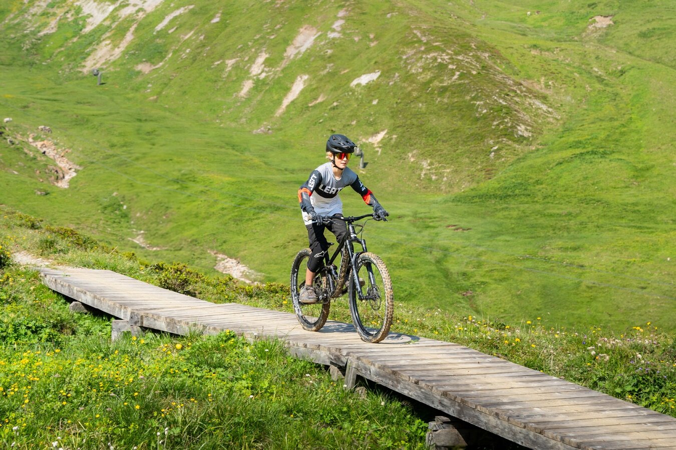 The “moderately difficult” track (red) invites advanced riders but should not scare off beginners. Through berms, rollers and various downslopes, which can be combined in different ways, everyone can find their own line and have a great time on the track: Whether you want to easily roll down and be amazed by the stunning panorama or tackle the run at high speed, both is possible on the Scheidtrail. After about 240 metres of descending, you coast smoothly alongside a creek back to the valley station of the Lazidbahn.