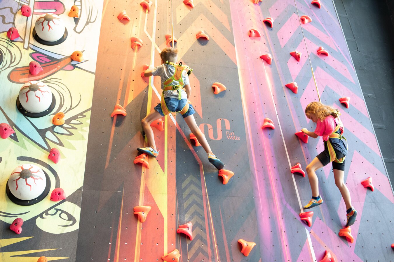 The colorful bouldering area with soft mats is perfect for younger children who want to discover their climbing skills in a playful way.